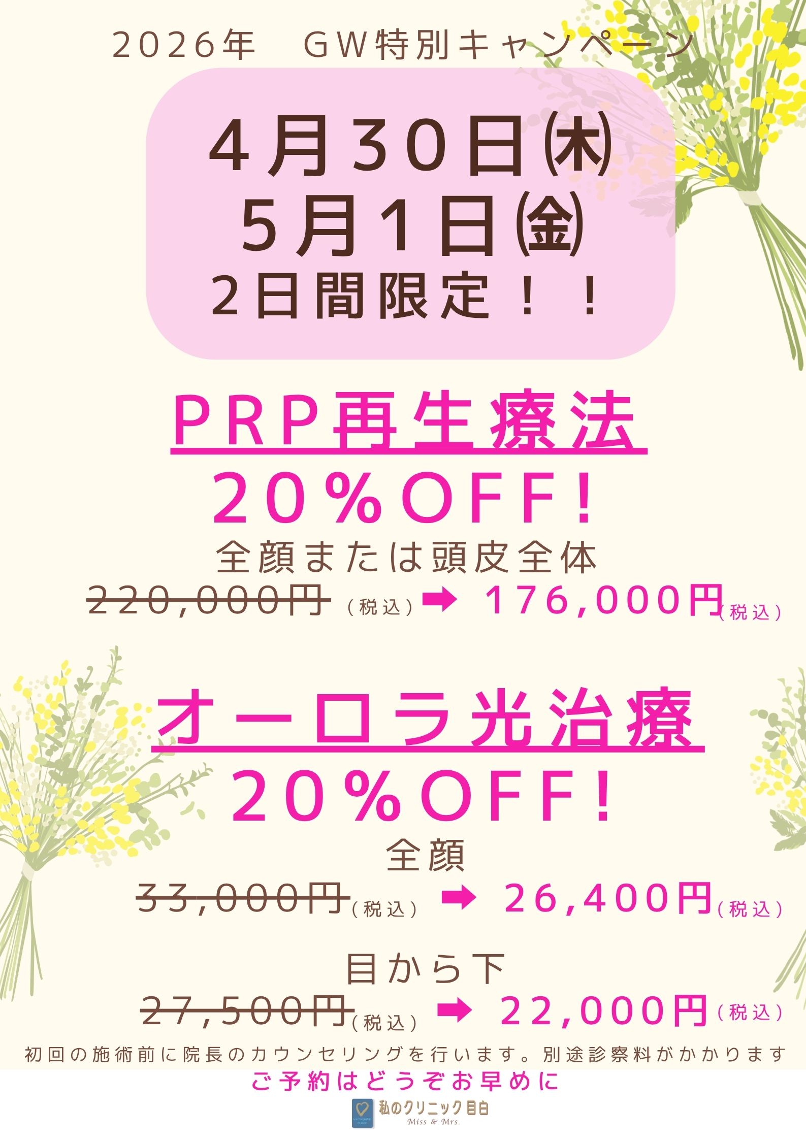 GW期間中の2日限定のスペシャルキャンペーンです。PRP(再生医療)がなんと20%オフの特別価格。